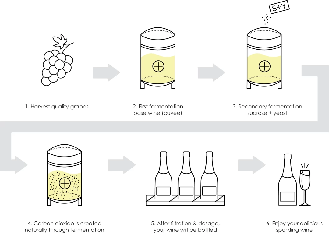 Our process begins with an exceptional base wine—the cuvée—crafted immediately following the primary fermentation of freshly pressed grapes. This cuvée is a carefully blended symphony of base wines, which is then enriched with sucrose and select yeasts for secondary fermentation in our sealed vessels.